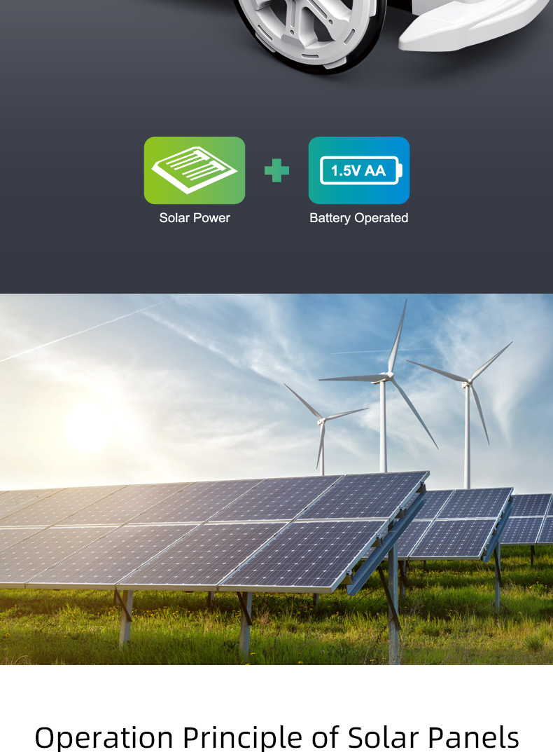 2.The solar-powered upgraded version has two modes of motion that can be switched: one requires two R6/AA/UM3 batteries for power, and the other is powered by a solar panel.